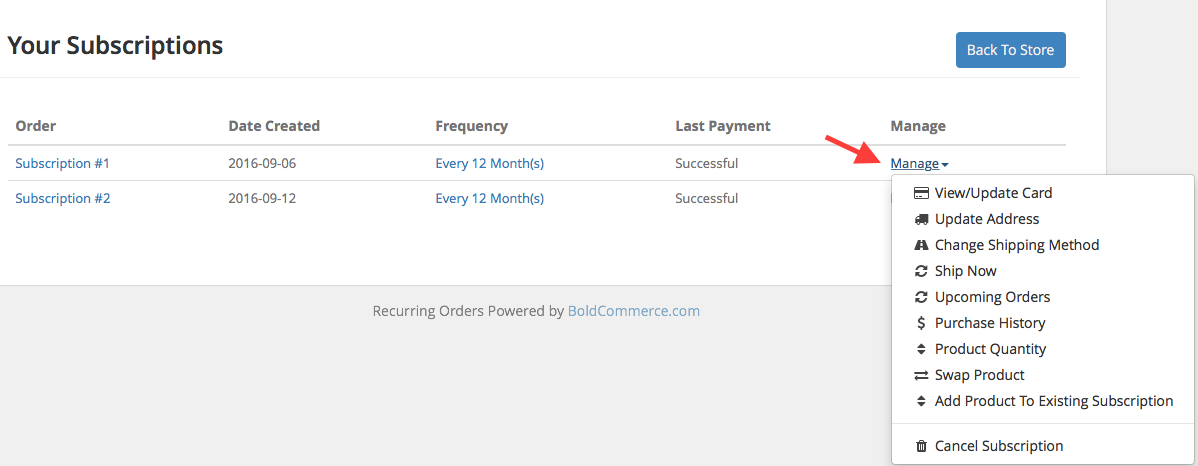 - Cancel Subscription - This will cancel all future orders for that subscription. It will not cancel an order that has already been placed in theist 24 hours. If you have multiple subscriptions and want to cancel them all, you must choose cancel subscription by choosing Manage dropdown for each Subscription #. Please read more below about already placed orders you wish to cancel.