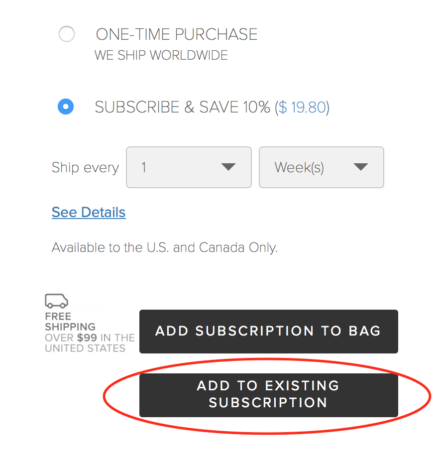 - Add Product to Existing Subscription - Please see the section below. Presently, you cannot add products to your subscription from your subscription management portal. You can visit our store choose your item and click: "ADD TO EXISTING SUBSCRIPTION"
